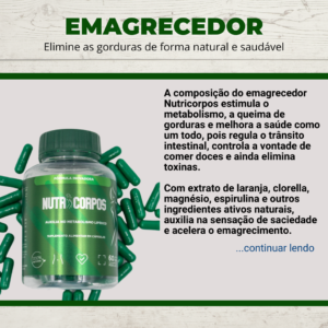 O Emagrecedor Nutricorpos possui em sua composição uma fórmula com produtos naturais que ajudam o metabolismo lipídico, ou seja, queima de gorduras. Com extrato de laranja moro, Clorella, Magnésio Bosglicinato, Espirulina, Psyllium, Bitartarato de Colina, Zinco